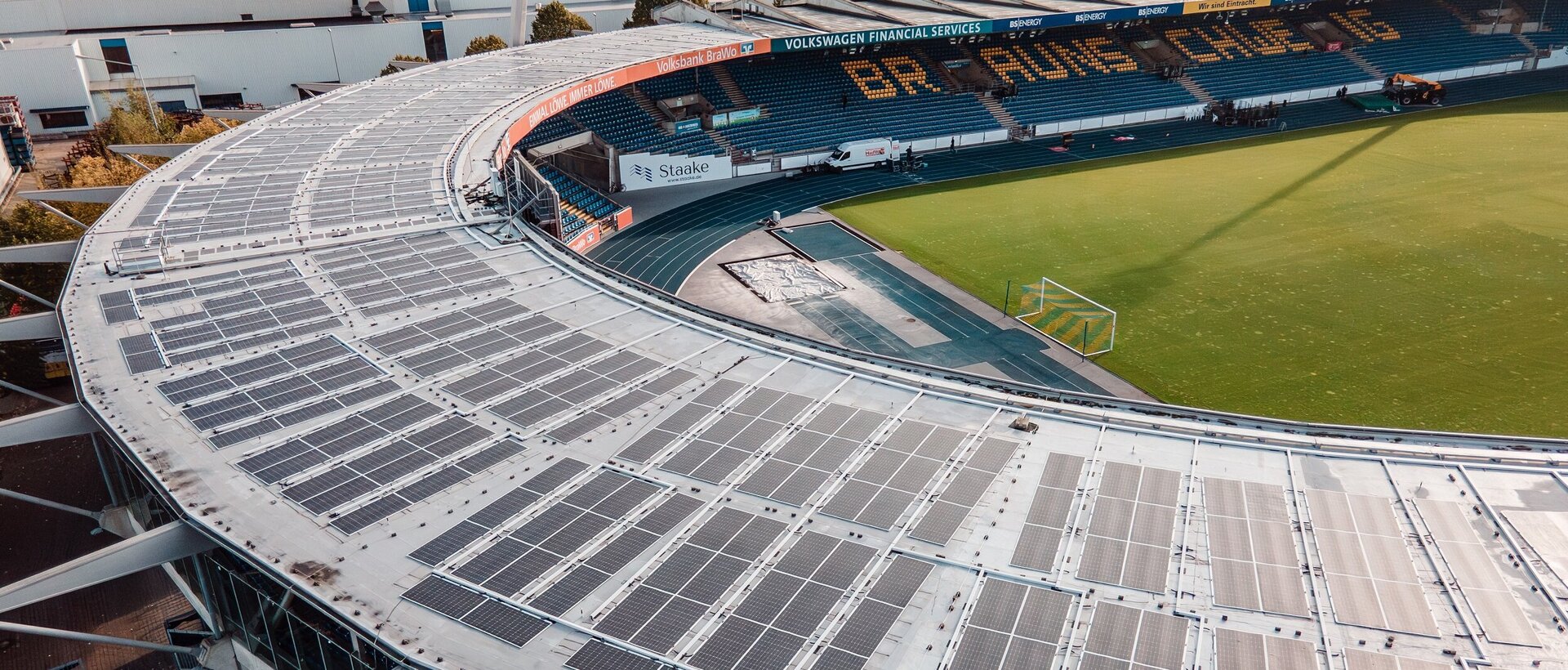 Die von der Energiegenossenschaft Braunschweiger Land eG in Betrieb genommene Photovoltaik(PV)-Anlage auf dem Dach der Nordkurve ermöglicht dem Stadion eine größere Autarkie in der Stromversorgung. Wir streben einen Eigenverbrauchsanteil von rund 80 Prozent für den Stadionbetrieb selbst, für Veranstaltungen sowie für die Büroräume im Gebäude an.